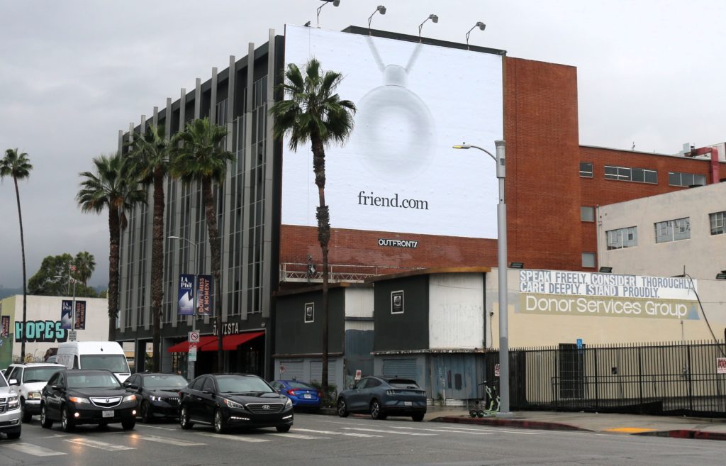 A billboard in Hollywood for “Friend,” a new wearable AI pendant that listens to your conversations and provides you with running commentary on what it hears. (Pablo Kay)