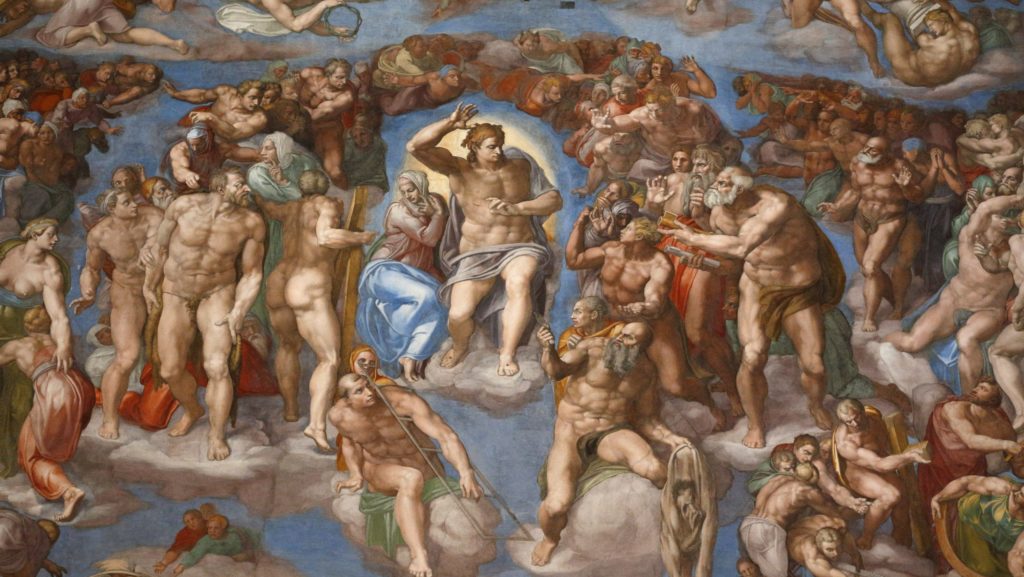 The monumental fresco covers the entire altar wall of the Sistine Chapel and depicts the second coming of Christ and the final judgment of souls. At the center stands a powerful figure of Christ, surrounded by saints and martyrs, as the dead rise from their graves below. Angels sound their trumpets while the saved ascend toward heaven and the damned are dragged downward into hell by demons.