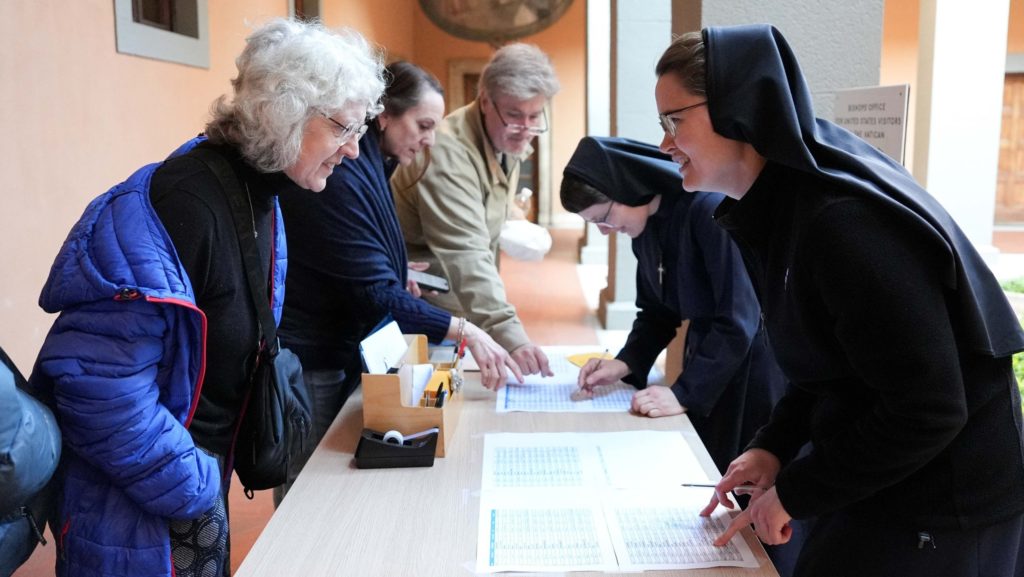 As they enter, they are greeted by smiling sisters and seminarians and directed to a table where they can collect their tickets. Then they are invited to stay for an orientation — a brief explanation of the Wednesday General Audiences, with some helpful tips to make their experience enjoyable and spiritually fruitful. Finally, they have an opportunity, if they desire, to prepare spiritually for the audience by receiving the sacrament of reconciliation.