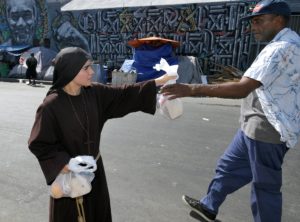 A sister belonging to the Friars and Sisters of the Poor Jesus, a religious order founded in Brazil, hands a sack lunch to a homeless man in downtown LA’s Skid Row in 2018. (John McCoy/Angelus)