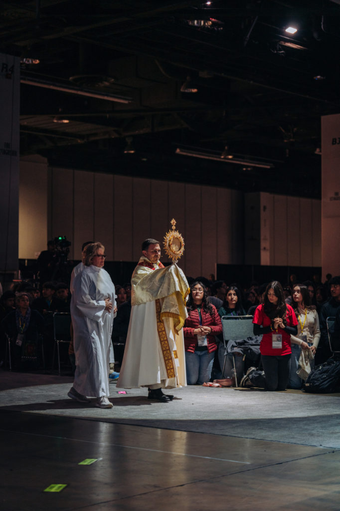 Students kneel as Father Parker Sandoval carries the monstrance holding the holy Eucharist during an adoration celebration at the Religious Education Congress’ Youth Day on Feb. 19. (Isabel Cacho)