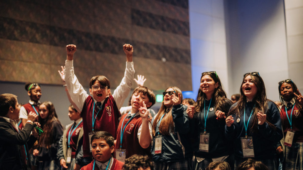 As the middle-school day kicked off, there was a lot of dancing. Catholic speaker and performer Joe Melendrez hyped up the youth with call-and-response chants — “Ain’t no party like a Jesus party!” — dancing to routines on video screens, and playing interactive games that got kids running around, making friends, high-fiving, and dancing on chairs.