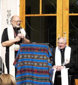 Father Chris Ponnet speaks at the October 2022 dedication of the St. Camillus Center for Pastoral Care’s healing garden. At right is Archbishop José H. Gomez. (Victor Alemán)