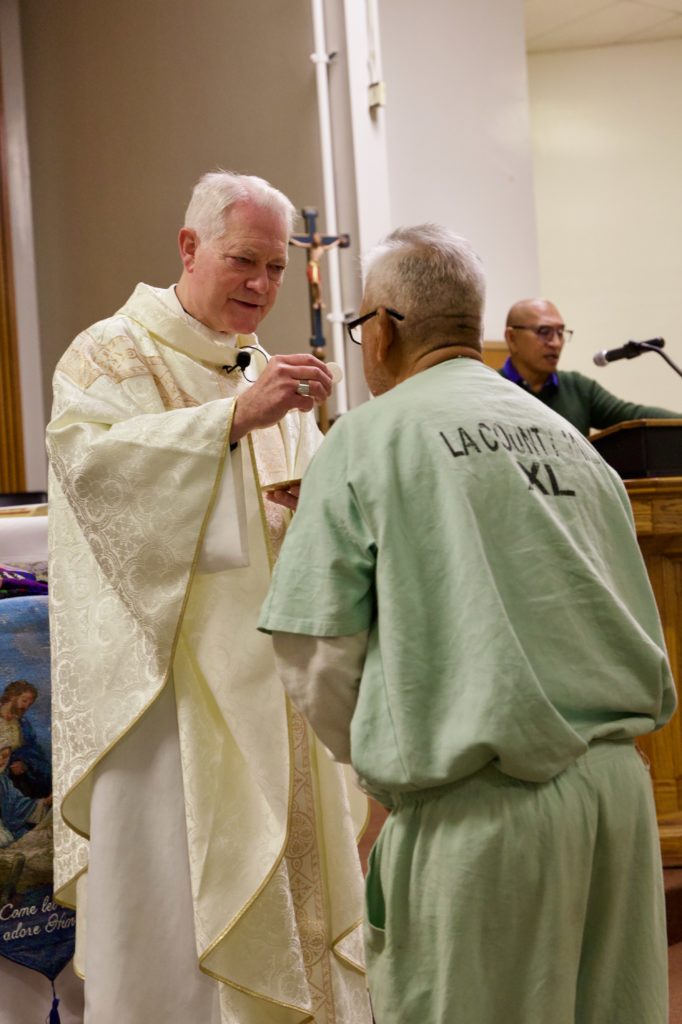 Auxiliary Bishop Matt Elshoff celebrated Christmas Mass with inmates at Men’s Central Jail near downtown LA. (Reese Cuevas)