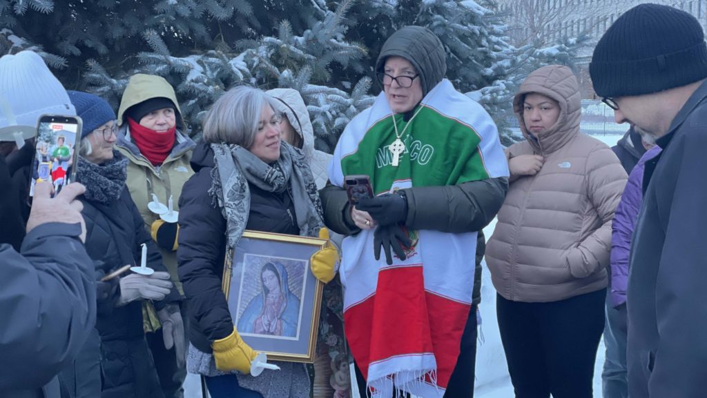 Across the street from the B.H. Whipple Federal Building at Fort Snelling along the Mississippi River in Minneapolis, people gathered with paintings of Our Lady of Guadalupe on her feast day, Dec. 12, for a special prayer service for those detained by U.S. Immigration and Customs Enforcement.