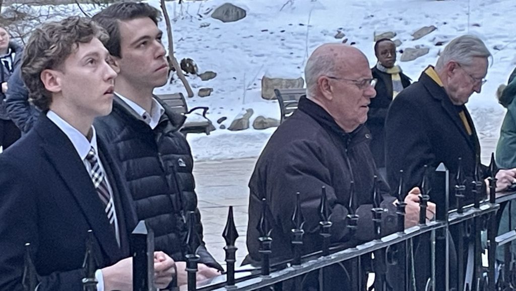 Gathered in the cold near a replica of the French grotto of Our Lady of Lourdes, a popular place for prayer on campus, Bishop Rhoades and students prayed the sorrowful mysteries of the rosary as the sun set in the late February sky. Some students stood holding rosaries, some knelt in prayer.