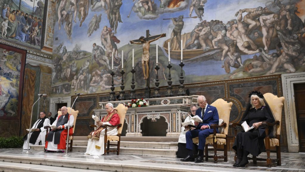 Pope Leo XIV led the midday prayer of the Divine Office, standing beneath Michelangelo’s fresco of “The Last Judgment” and flanked by Anglican Archbishop of York Stephen Cottrell, King Charles, and Queen Camilla.