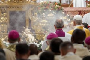 "While a distorted economy leads us to treat human beings as mere merchandise, God becomes like us, revealing the infinite dignity of every person," he said. "While humanity seeks to become 'god' in order to dominate others, God chooses to become man in order to free us from every form of slavery."