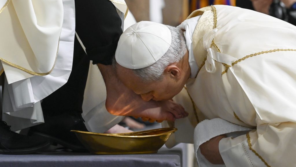 The pope's words came during a Mass that commemorates Jesus' institution of the Eucharist and the priesthood, and includes the traditional foot-washing ritual, which reflects the call to imitate Christ by serving one another.