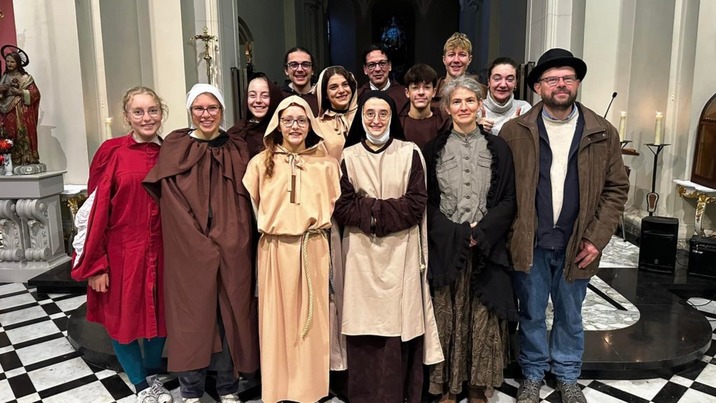 A mother and a child dressed as a Catholic saint celebrate Holywins festival in the Sanctuary of St. Juliana of Cornillon, better known as Juliana of Liege, in Belgium, Oct. 29, 2023. Across Europe, Catholic families are turning Halloween into a celebration of light, life and holiness with "Holywins" -- a play on "Holy" and "Halloween." The movement began in Paris in 2002 and has since spread to Poland, Belgium, Italy, Spain and beyond. (OSV News photo/courtesy Holywins Liege)